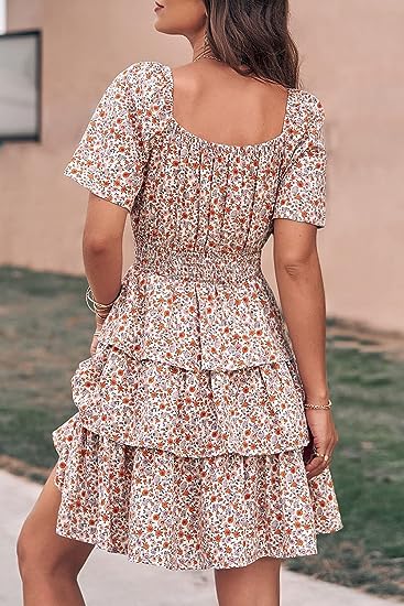 TRENDY DESIGN: Square Neck Boho Dress For Women/Floral Print Short Dress For Women/Swing Dress For Women/Short Sleeve Mini Dress For Women/High Waist A-Line Dress For Women/Tiered Fit And Flare Dress For Women/Summer Dress For Women /Casual Beach Dress For Women/Party Dress For Women/Ruffle Dress For Women.